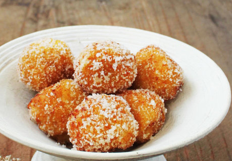 4、用大拇指和食指的虎口处挤成大小均称的丸子,放温油中小火炸至全部在油中浮起,呈金黄色捞出