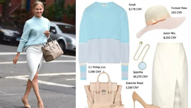 粉彩蓝色的套头毛衫,搭配白色斜开衩铅笔裙,出街造型格外清新养目。裸色手提包与高跟鞋永远是这类粉彩衣装的好搭档,无论出席什么场合,如果你纠结于搭配何样色调的配件,那么选它们就无误了。
