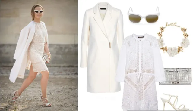 简约风格的长大衣搭配蕾丝裙的整身白色造型,保持轻盈与若隐若现的朦胧美,是将白色穿出盎然生机的诀窍。告别古板的配饰,一副帅酷太阳镜或一双富有女人味的细带高跟鞋,都能为造型增添一抹别样韵味。