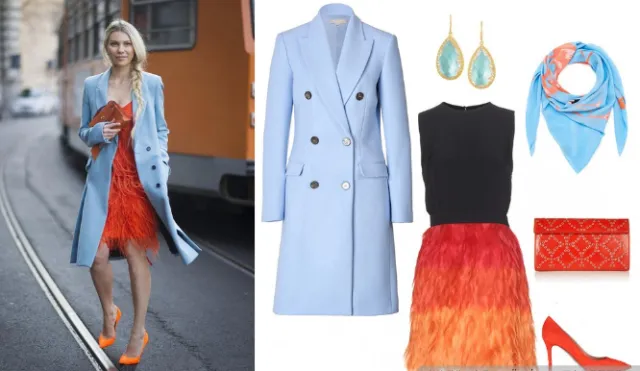 看上去最抢眼的撞色搭配,其实最不易搭配,可以选择并不饱和的蓝色外套,搭配饱和度高的橘色连衣裙,飘逸的羽能够为撞色配比增添丰富的细节感。配饰上保持色调一致,就不容易出错。