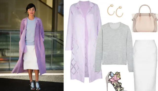 一件轻薄剪裁的淡紫色长外套,与灰色圆领针织衫与白色直筒裙相搭配,瞬间令基础单品变得赏心悦目。除此之外还搭配了淡彩且多趣的高跟鞋,当然,只要一件如此个性的配饰就好,整体造型保持简约才能衬托格调。