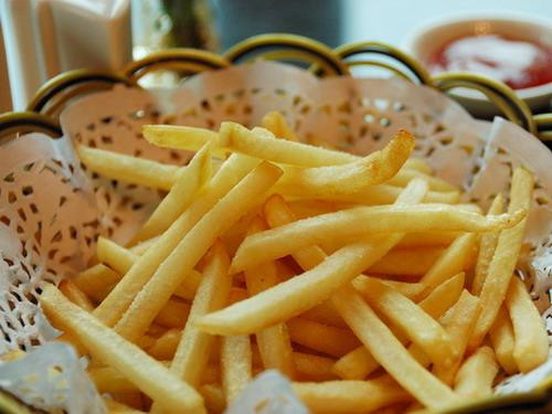 贴士:最好不要偷懒用超市卖的现成冷冻薯条,因为只有土豆切出来的新鲜薯条才会酥软可口。可以根据个人喜好加入番茄酱。