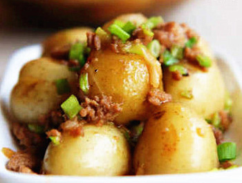 原料:小土豆500克、肉末150克、香葱80克、油2匙、盐、生抽1匙、糖、黑花椒粉、姜