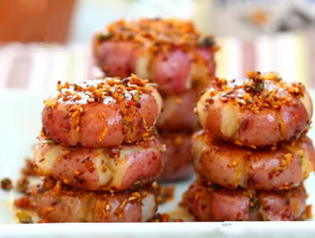 ①小土豆洗净,带皮放入开水锅中加入少许盐煮熟,轻轻按扁。