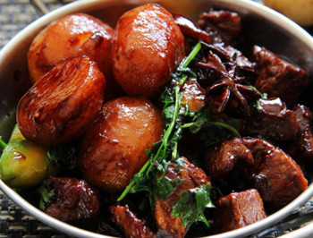 作法:炒锅内加油,烧热后下葱花爆锅,然后下肉翻炒几下,放点盐和酱油适量;将土豆和茄子同时下锅,翻炒;在炒的过程中加盐、鸡精、味精、少量的醋;翻炒到基本上茄子都过了油、土豆颜色加深后,向锅内加清水,水量控制到菜的四分之三位置;盖上锅盖炖一会,出锅前20秒左右加准备好的大蒜、香菜或者香油。