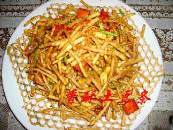 ③将烫好的土豆丝捞起,放在盆里,撒上蒜末、辣椒面(事先炸好的辣椒油也可以),不过没有现炸的香。
