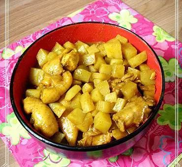 ②锅洗净放油,加热后放入切好的土豆、胡萝卜、洋葱翻炒,加水,大火煮十分钟后起锅(水要多加,大火煮食比较费水,容易干锅),见洋葱融化即可,加入咖喱(咖喱要预先用凉水调开),加入盐、糖,转小火煮五分钟即可。