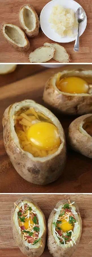 6、把土豆洗净蒸熟,挖空后塞点喜欢的蔬菜培根之类的,打入一个鸡蛋,再放入烤箱烤熟,美味极了!