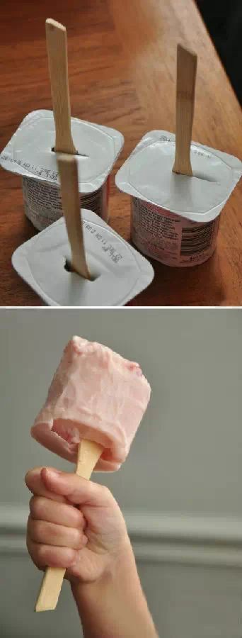 5、盒装酸奶顶部开小口,插入冰棒棍儿放冰箱冷冻室冻硬,吃的时候撕掉表面封口抽出来即可!