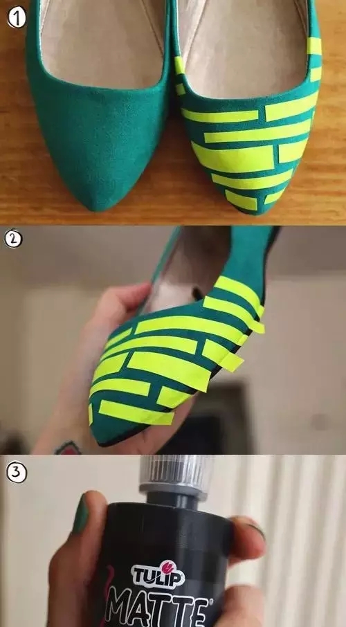 3.在鞋子底部垫上一块布,用喷漆将整个鞋面喷满油漆,再用小刷子将喷漆涂抹均匀。待油漆晾干后,撕去便条贴就会呈现你所设计的印花条纹了。