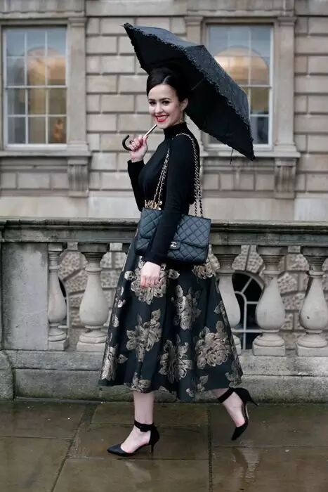 ▼时尚大主编安娜的印花连衣裙配风衣,是职场装的典范之一