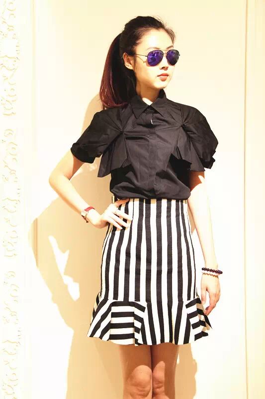 显瘦要诀: 竖条纹与生俱来的显高显瘦功能已经被论证过多次,但并不意味着全身竖条纹就会让你变“纸片人”。 如果你是H型身材的壮姑娘,全身竖条纹只会进一步淹没你曲线。在腰部用上一些横向的元素,譬如一条宽腰带,能有效打破僵局。