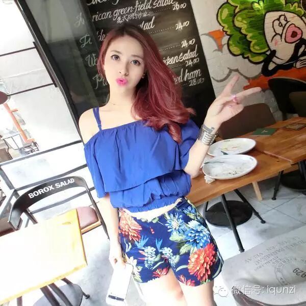 10、一字领露肩棉质收腰吊带娃娃衫。