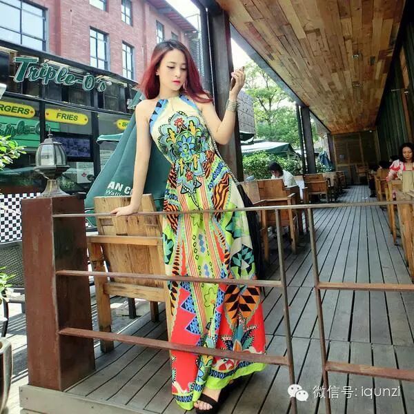 9、性感热带印花挂脖流苏系带露背连衣长裙。