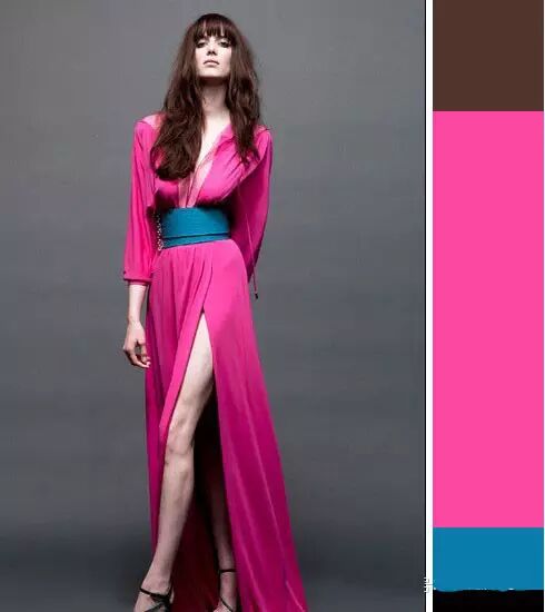 小面积的宝石蓝搭配在桃红色长裙中,显得时尚而又优雅。