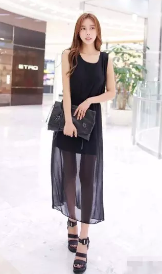 黑色无袖连衣裙,简洁大方的收腰款式,衬托出玲珑曲线,裙摆采用透视薄纱,朦胧性感,美腿若隐若现,很是诱人。