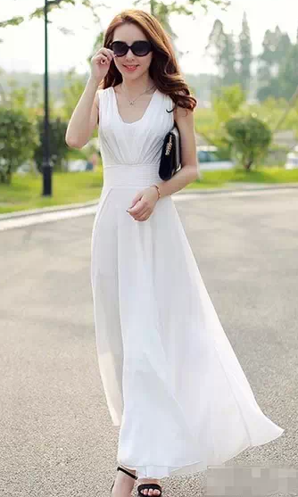 白色收腰长裙唯美至极,无袖低胸款式,清爽而性感,飘逸的裙摆柔美梦幻,让你瞬间变仙女