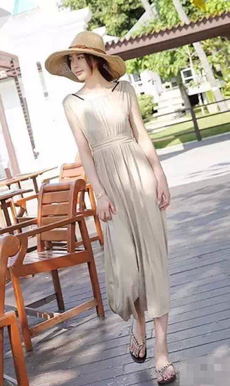 裸色雪纺长裙,清爽的无袖款式,颜色清新而优雅,女人味十足,轻盈的雪纺材质,显得柔美飘逸,收腰款式衬托出曲线,真是女神范儿。