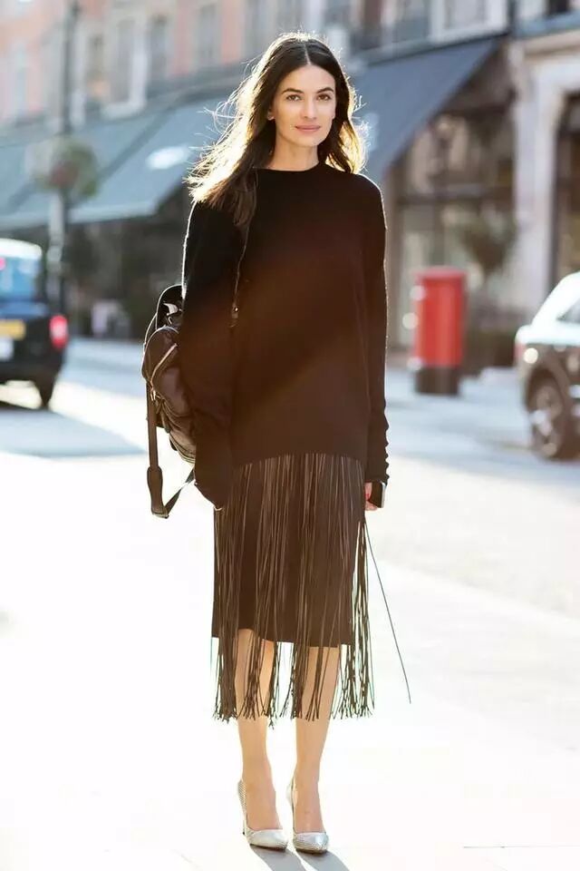 如果你的裙装和上衣都是黑色,没什么特点的话,可以选择流苏元素来点缀,这样整体效果就会比黑搭黑要时尚得多!想时尚流苏元素少不得!