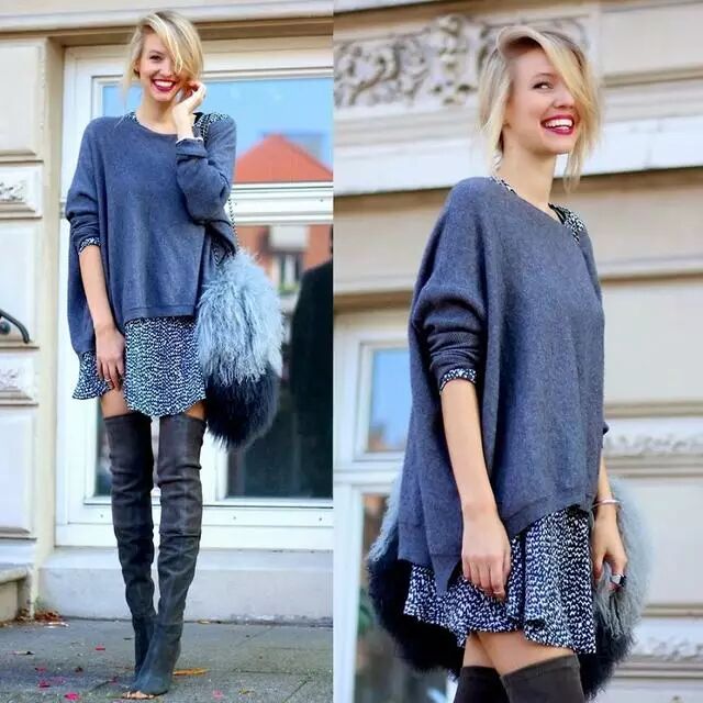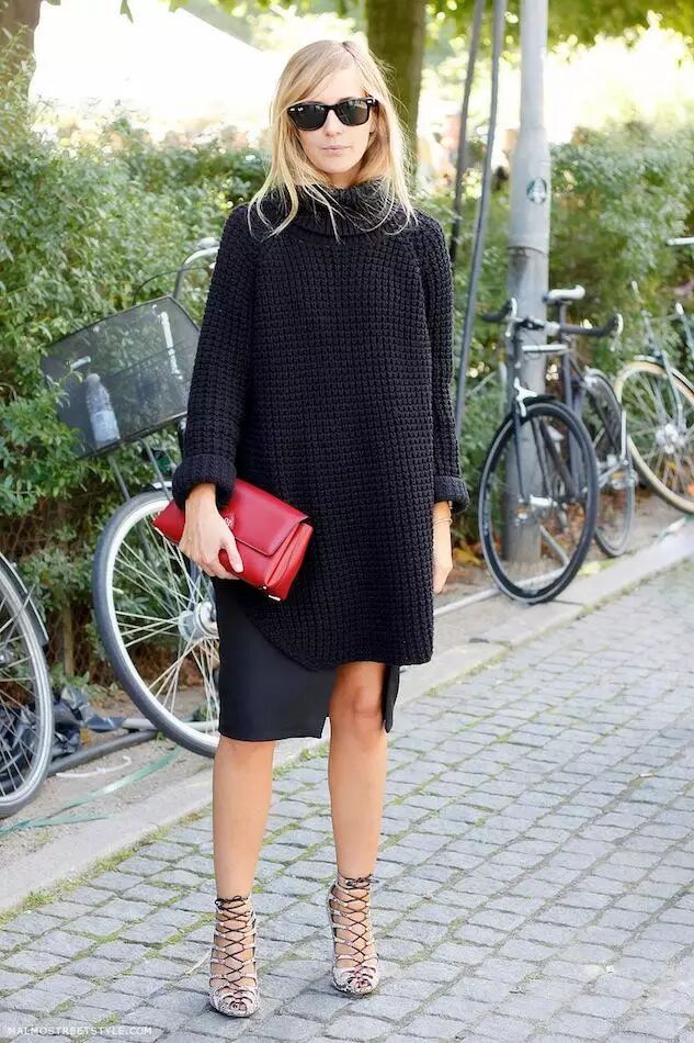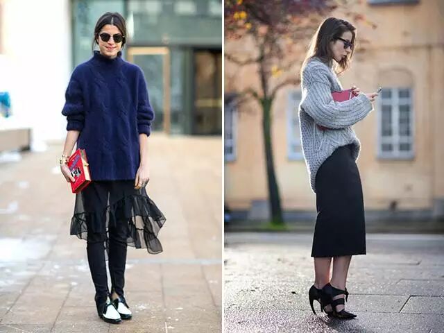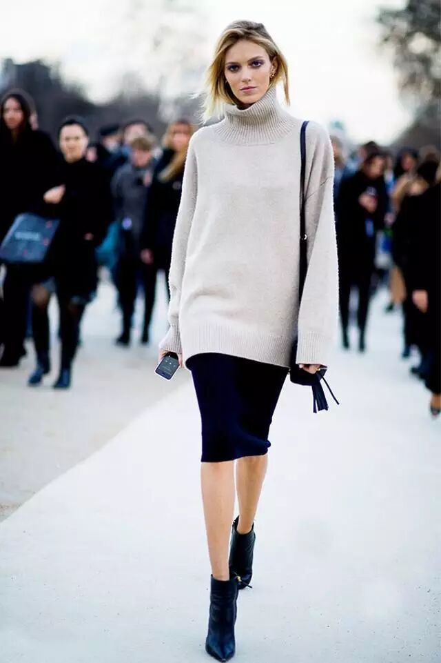 一直觉得包身裙是女人味十足的单品,但是搭配上一款Oversized毛衣,会增加几分休闲。黑色包身裙搭配这种淡灰色的毛衣,看起来暖暖的。