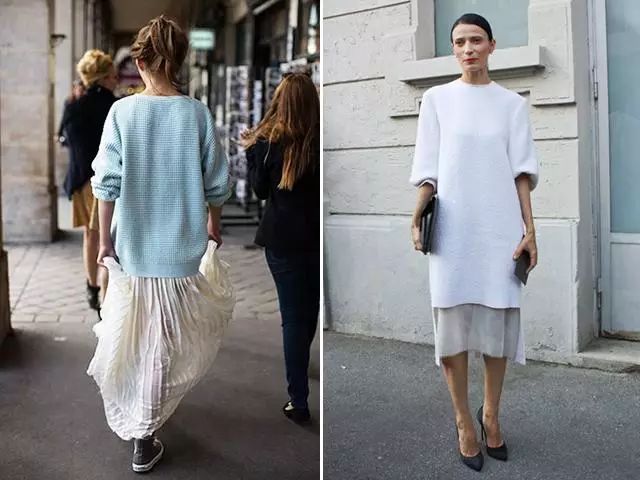 或者像这样,把Oversized上衣衣角塞进裙装里,打造一种不规则的随意感。