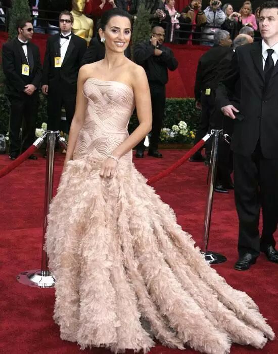 另外一个在奥斯卡红毯上不得不提的造型,出自2007年的奥斯卡颁奖礼。女演员Penelope Cruz 身穿的这条抹胸羽毛长裙惊艳了在场的所有人。