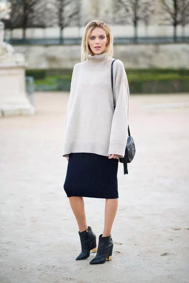 超模Anja.Rubik用浅灰色高领针织毛衣搭配过膝铅笔裙,上身宽松,下身紧绷,呈现出简约而精致的倒三角轮廓,柔和的色调中浑身上下散发出优雅气息。