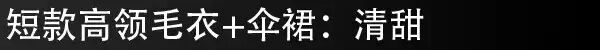 短款高领毛衣搭配轻薄的伞裙,打造出曼妙、优美的A字型下摆,毛衣和伞裙尽量选择同一色系,便于造型搭配,而鞋包也可以选择同色系作为呼应。