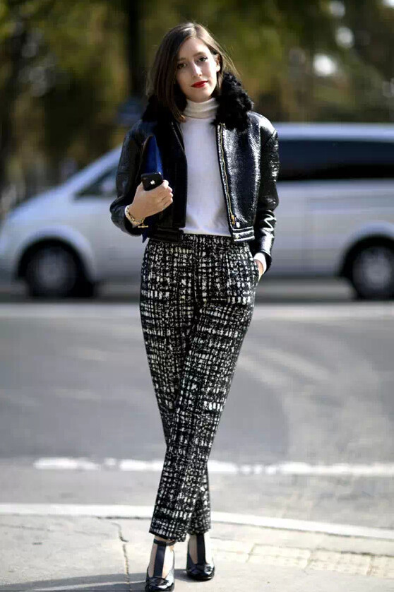 意大利版《Grazia》时装编辑Eleonora.Carisi身穿白色细针织高领毛衣,搭配黑白格纹花呢长裤,外套线条硬挺的黑色圆领皮衣,脚踩及踝裸靴,保暖性没得说,简单的黑白组合中,个性与优雅的结合更为可贵。