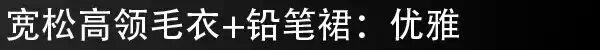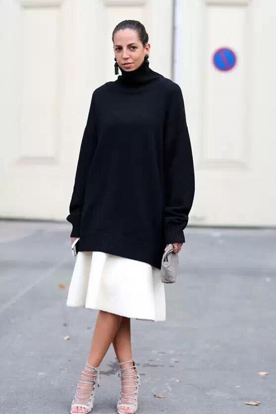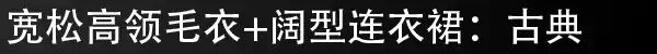 如果你正好有一款深色高领毛衣,不妨用来搭配裙摆挺阔的连衣裙,从颈部开始到裙摆截止,呈现出优雅、流畅的A字型线条。