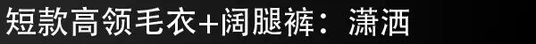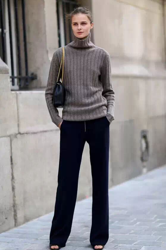 灰色粗针织高领毛衣搭配黑色阔腿裤,垂至脚背的笔直裤管增强气场,潇洒帅性,自信满满。