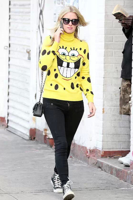 Nicky.Hilton这件Moschino海绵宝宝高领毛衣,穿在身上立马有了古灵精怪的可爱气质,有趣的图案顿时博人眼球,搭配同样休闲的Converse帆布鞋,潮爆街头。