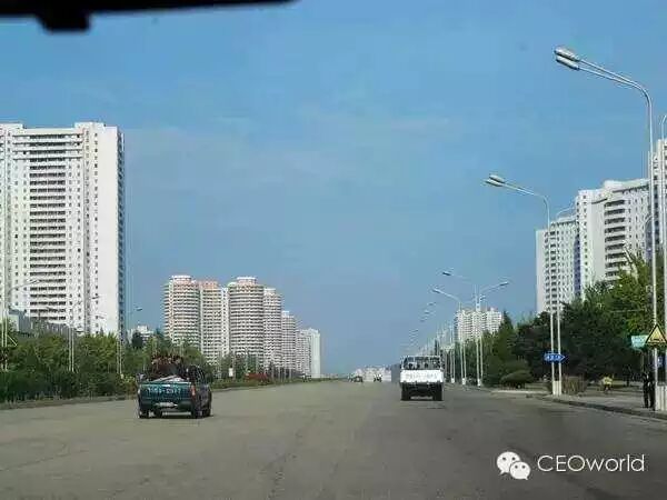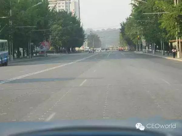 这是平壤的长安街,朝鲜时间早北京时间一小时,这是下午5点多晚高峰的路况,北京的孩儿,羡慕吧!