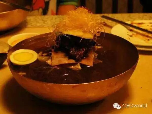 冷面的味道让我大跌眼镜,我家楼下的小饭馆都比这个好吃,原来朝鲜冷面是这个味道,不酸不甜有点咸,需要自己兑白醋,里面的料倒是挺足,肉片、鸡蛋丝高高码成一摞,用一个厚重而华丽的大铜碗装着,话说你把冷面做成这个味道,真有点对不住这个碗!