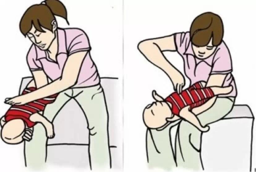 2,如果上述操作异物没出来 可以采取另外一个姿势,把孩子翻过来,躺在坚硬的地面或床板上,抢救者跪下或立于其足侧,或取坐位,并使患儿骑在抢救者的大腿上,面朝前。抢救者以两手的中指或食指,放在患儿胸廓下和脐上的腹部,快速向上重击压迫,但要很轻柔。重复,直至异物排出。