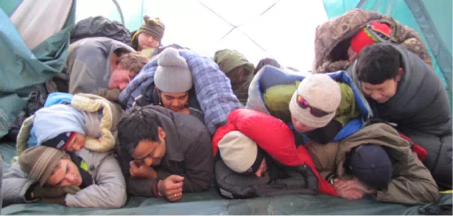 利用你所有的物品抗寒,穿着绒衣、袜子睡觉,其他所有的衣服都盖在睡袋外面,最好在身体下面也垫上几件(羽绒睡袋尤其要垫,也可以多带半张防潮垫,垫在颈部一下臀部以上),背包可以套在脚部,也可以放在防潮垫下面,增厚防潮垫隔热层,羽绒服盖在上面比垫在下面好,冬季活动羽绒服是比备品,户外、民用的羽绒都无所谓,它的好压缩、重量轻最便于携带。