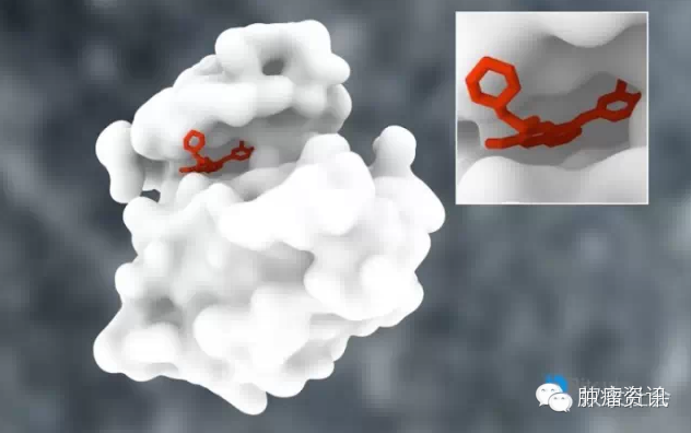 (图):3D分子图片显示肺癌中突变的EGFR癌蛋白(灰色),和靶向药物易瑞沙(红色)。靶向药物就像钥匙一样,精确地锁住癌蛋白上的活性中心,从而抑制癌变蛋白,杀死癌细胞(感谢作者bitcyte)。