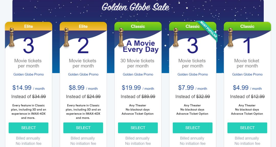 那么像我这样想看几十部电影、每年都想过电影大年的同学怎么办呢?因为你坚持读完了这篇文章,送你一个福利:Sinemia。现在正好有金球奖促销,我看中的那一款计划只要7.99。网址是https://www.sinemia.com/new-plans。不用谢。
