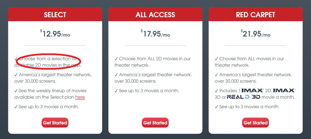 顺便说一句,最近MoviePass每天都给我写信,劝我接着买他们的观影计划。那天我仔细看了一下,MoviePass现在有三种计划,其中最基本的也是跟我去年买的计划最接近的一种,是每个月12.95,最多可看三场电影。