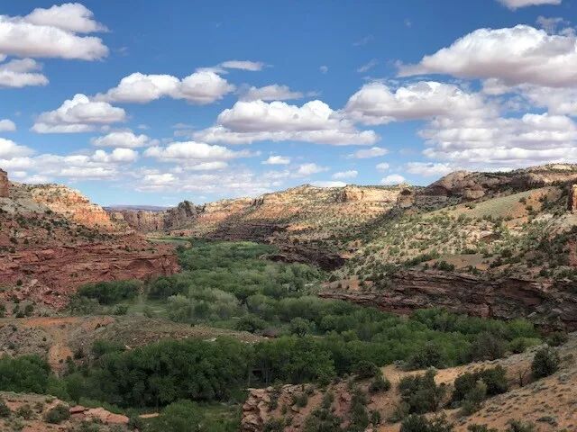 埃斯卡兰特河蜿蜒穿过峡谷,河谷中是郁郁葱葱的棉白杨:
