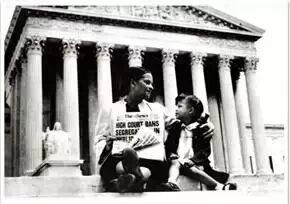 我讲个故事,去更好得阐明“leadingout(引导出来)”这样一个好的想法。一个美国的联邦大法院,前边坐着两个人,一个是4岁的黑人小姑娘,一个是她的母亲。他们很高兴地举着这张报纸,上面写的字是:最高法院今天禁止了在中学里面发生的种族隔离制度。这张照片拍于1956年,在那一年小姑娘想去自己社区里面的白人学校被拒绝。因为当时白人学校和黑人学校是不能混合的。