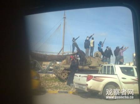 从车窗看出去,班加西的马路上全是举枪的人(图片来自翻译先生)