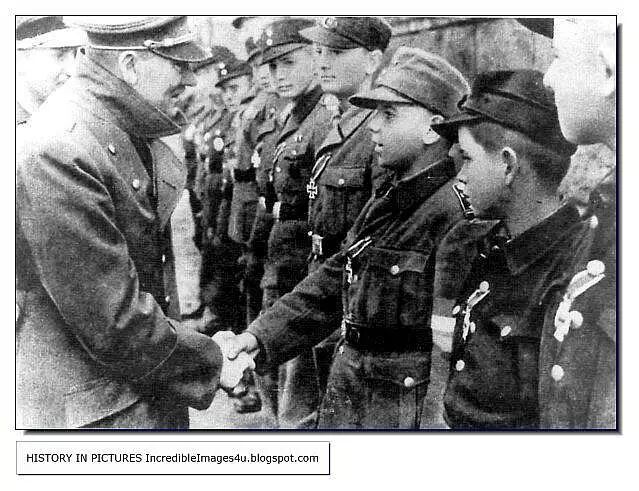 这是3月20日希特勒最后一次公开露面,在总理府的花园他接见了作战勇敢的希特勒青年团员。和希特勒握手的娃娃脸是一个名叫Wilhelm 'Willi' Hübner的15岁传令兵,他因为作战勇敢被授予二级铁十字勋章,他边上带深色帽子的希特勒青年团员名叫Alfred Czech,这个12岁的孩子在战场上用自家马车救助了十多个德国伤兵。在授勋仪式上,远方苏军的炮声已经隐隐可闻。很幸运,这两个孩子都在后面的战争中幸存了下来。