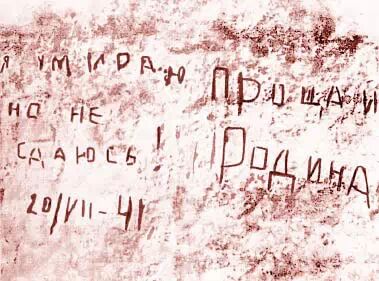 但是要塞的守卫者依然在抵抗,这是后人在要塞墙上发现的,守卫者用刺刀刻下的字句。左边刻着:我就要死了,但是我不投降!右边刻着:再见,祖国。