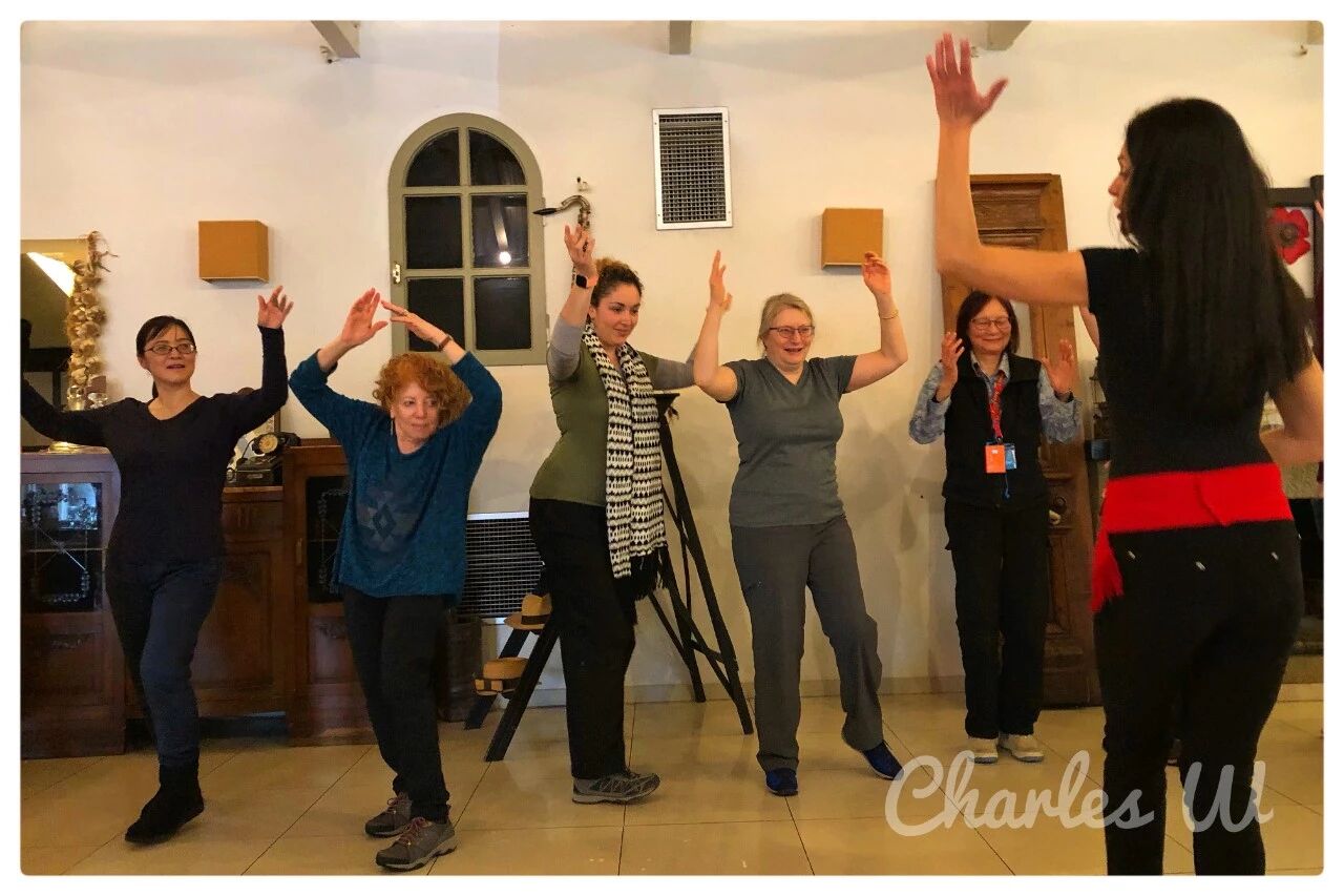 当地人示范跳希腊舞, 团员学跳希腊舞蹈。