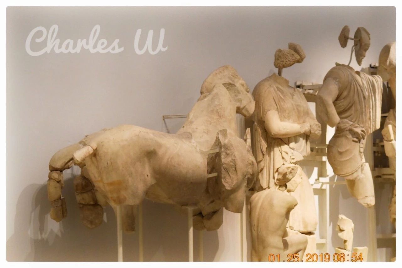 下面奥林匹亚考古博物馆展室里,有不少来自奥林匹亚遗址水神庙(Nymphaeum)上的雕像。隔壁的房间里摆放着皇帝及其家人的雕像,而位于房间中央的公牛则是装饰着水神庙喷泉的杰作。公牛身上刻着密码。