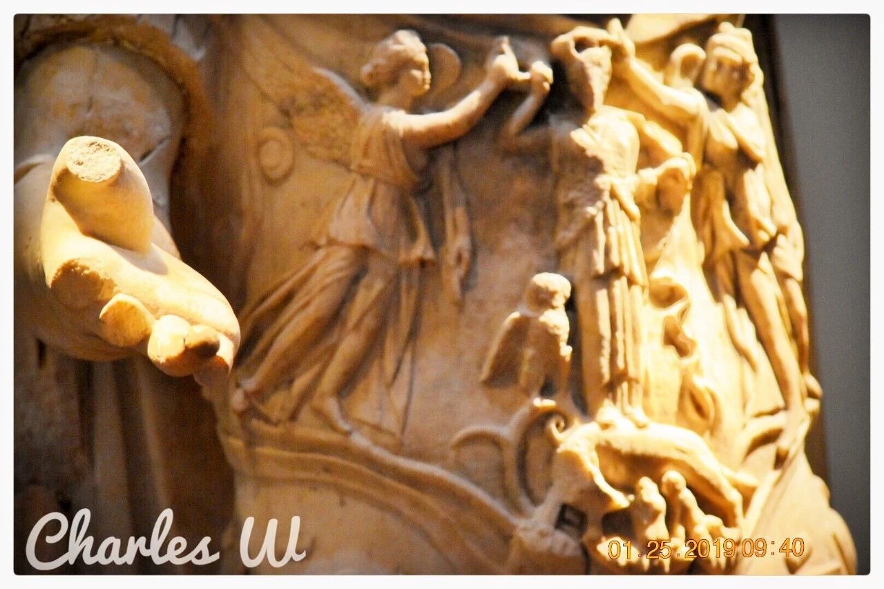注意雕塑前胸上的人物。他们代表着希腊与罗马文化的融合,也反映了这位罗马大帝的世界视野。中间是雅典娜,站在狼之上。狼下面是正在吸吮的双胞胎。两侧是耐克神,右边有猫头鹰(owl), 左边有直立的蛇。智慧女神雅典娜代表希腊,而有吸吮双胞胎的狼,Romulus 及Remus代表着罗马。