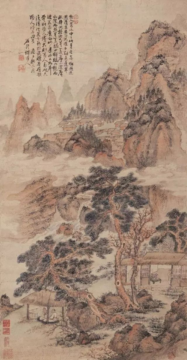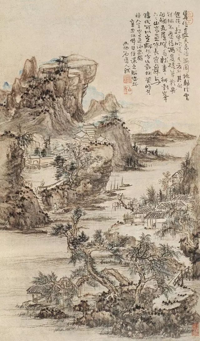 清 髡残 松岩楼阁图 立轴 纸本 设色 纵41.6厘米 横30.4厘米 南京博物馆藏