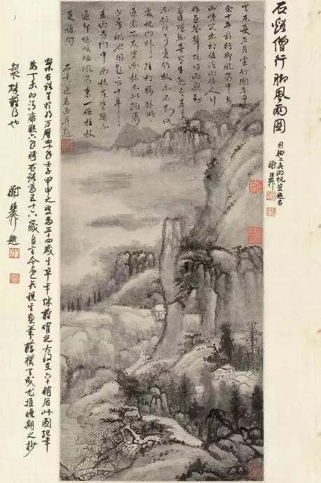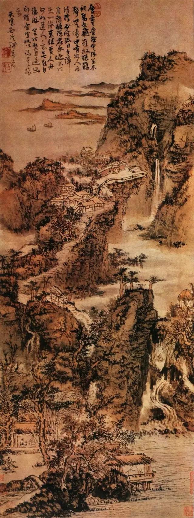 清 髡残 秋晖蒙钓矶 1661年作,125.5×40cm。题识:绣岭宫前西日晖,忽惊岚气上人衣。人家隔岸留残照,楼阁经年掩翠微。游子不知秋已暮,蹇驴直与世相违。何当写 我临流处,黄石桥头看钓矶。千尺飞流落半空,散为烟雨尽蒙蒙。草堂留在匡庐曲,头白归来睡霭中。辛丑(1661年)秋八月华公北归留此纸属余涂之,幽栖石 溪残道人。
