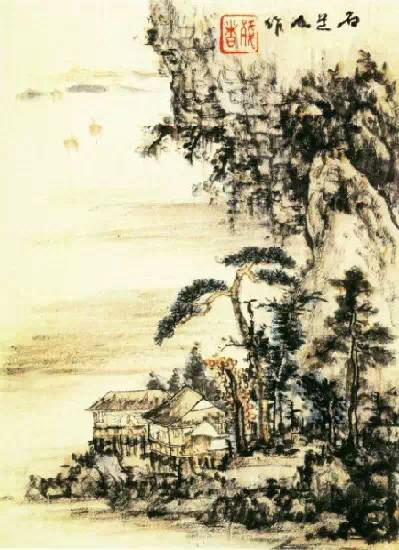 石 溪(髡残)山水画主要继承元四家传统,构图繁复重叠,境界幽深壮阔,笔墨沉酣苍劲,以及山石的披麻皴、解索皴等表现技法,多从王蒙变化而来;而荒率苍浑的 山石结构,清淡沉着的浅绛设色,又近黄公望之法。在平淡中求奇险,重山复水,开合有序,繁密而不迫塞,结构严密,稳妥又富于变化,创造出了一种奇辟幽深, 引人入胜之境,他喜用渴笔、秃毫,苍劲凝重,干而不枯,并以浓淡墨色渲染,使得笔墨交融,形成郁茂苍浑、酣畅淋漓的情趣,使画面产生雄浑壮阔、纵横蓬勃的 气势。